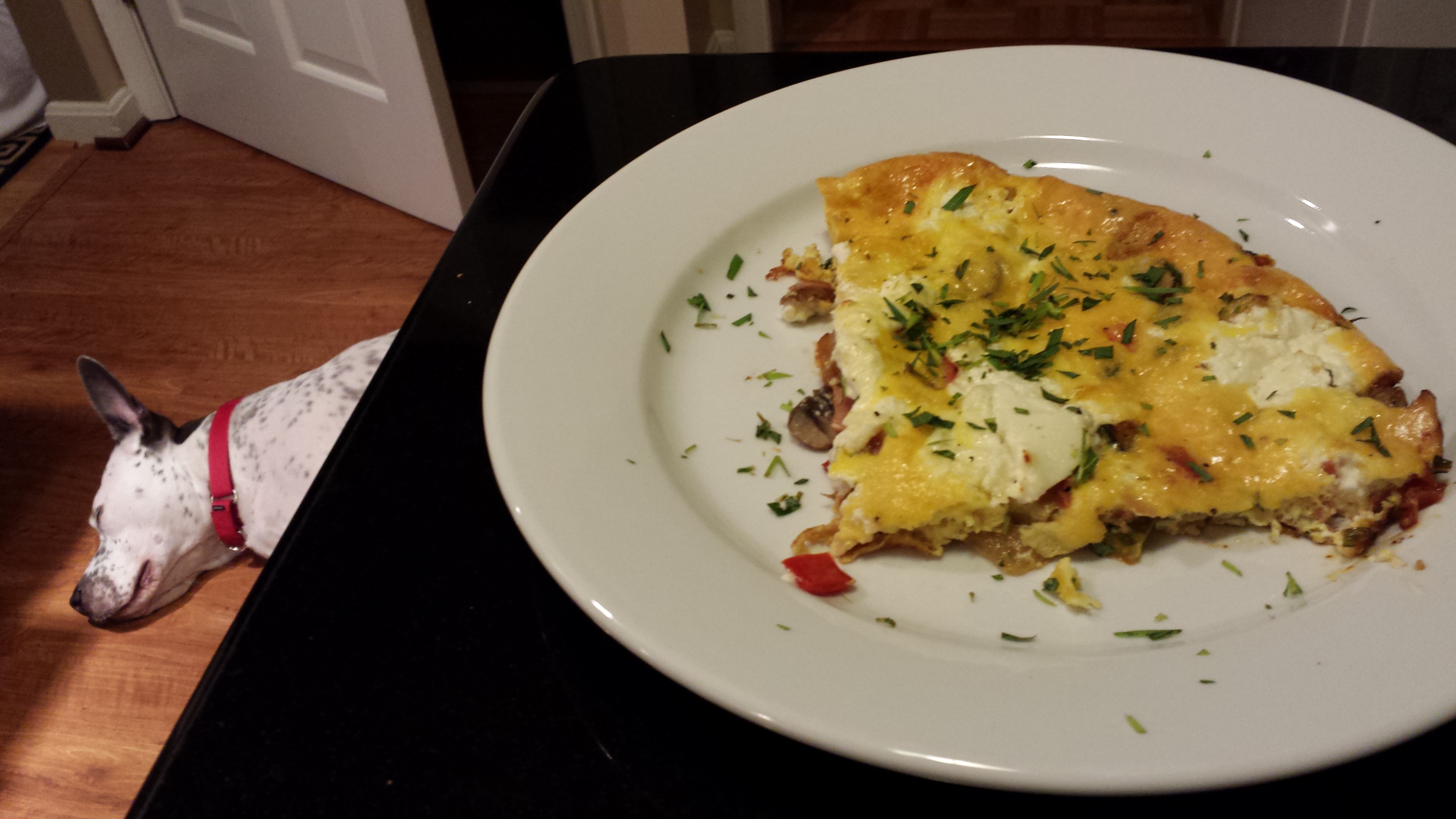 AddyAndFrittataAI My dog is pretending that he has no interest in the vegetable frittata in hopes he will get a taste (Photo Credit: Adroit Ideals)