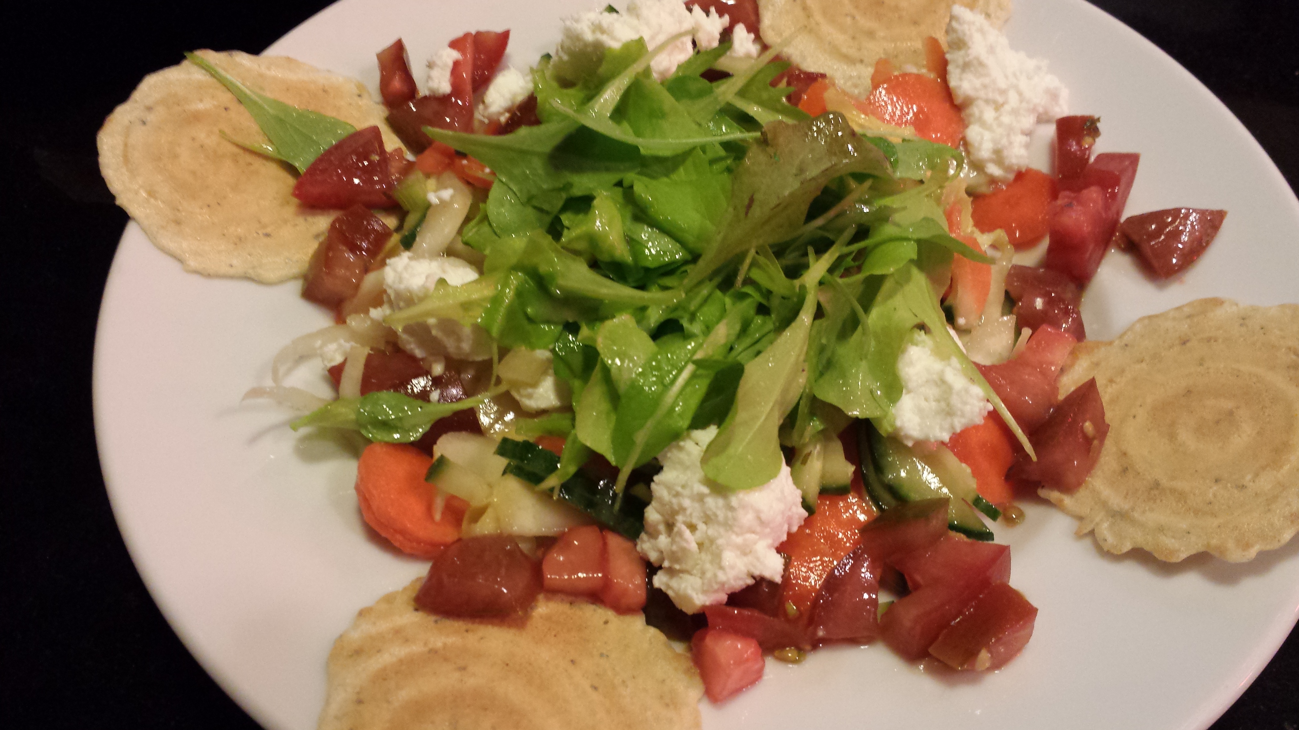 BabyGreensSaladAI Baby Greens Salad from my garden with Tomatoes, Cucumbers, Carrots and Goat Cheese Chunks. Dijon Mustard Vinaigrette. Rosemary Wafers. (Photo Credit: Adroit Ideals)