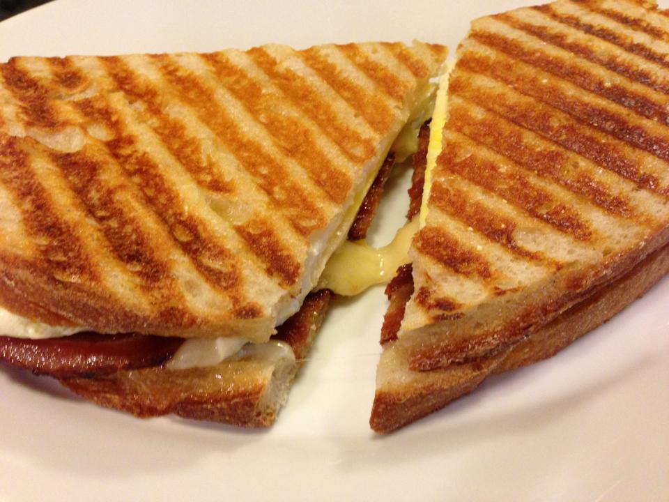BreakfastPaniniBaconEggCheeseAI Homemade Breakfast Panini Sandwich: Crispy Bacon, Egg, and Melty Cheese. (Photo Credit: Adroit Ideals)