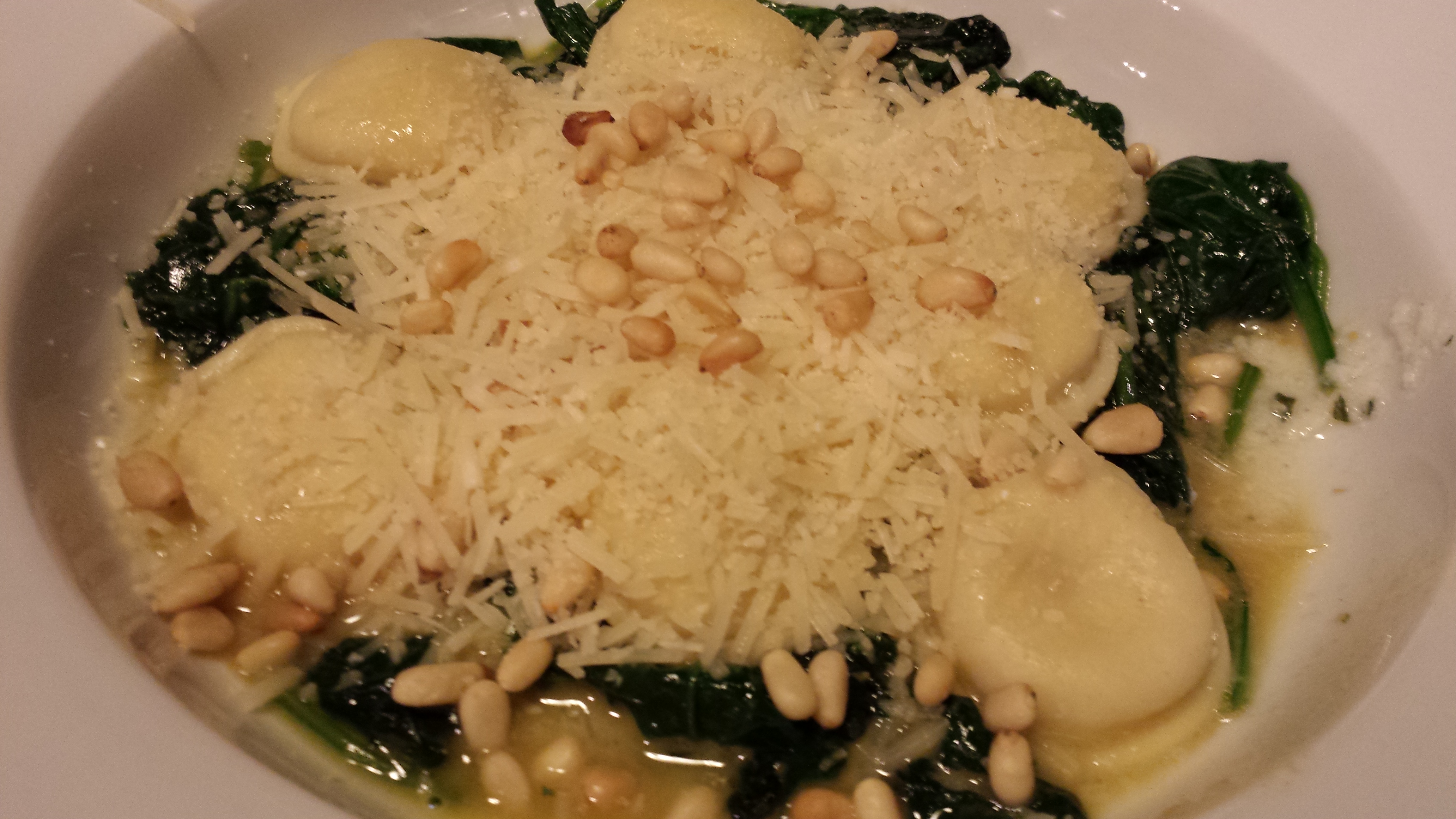 CheeseRavioliSpinachPineNuts4AI Cheese Ravioli with Sauteed Spinach in a Garlic Butter Sauce topped with Parmesan and Toasted Pine Nuts (Photo Credit: Adroit Ideals)