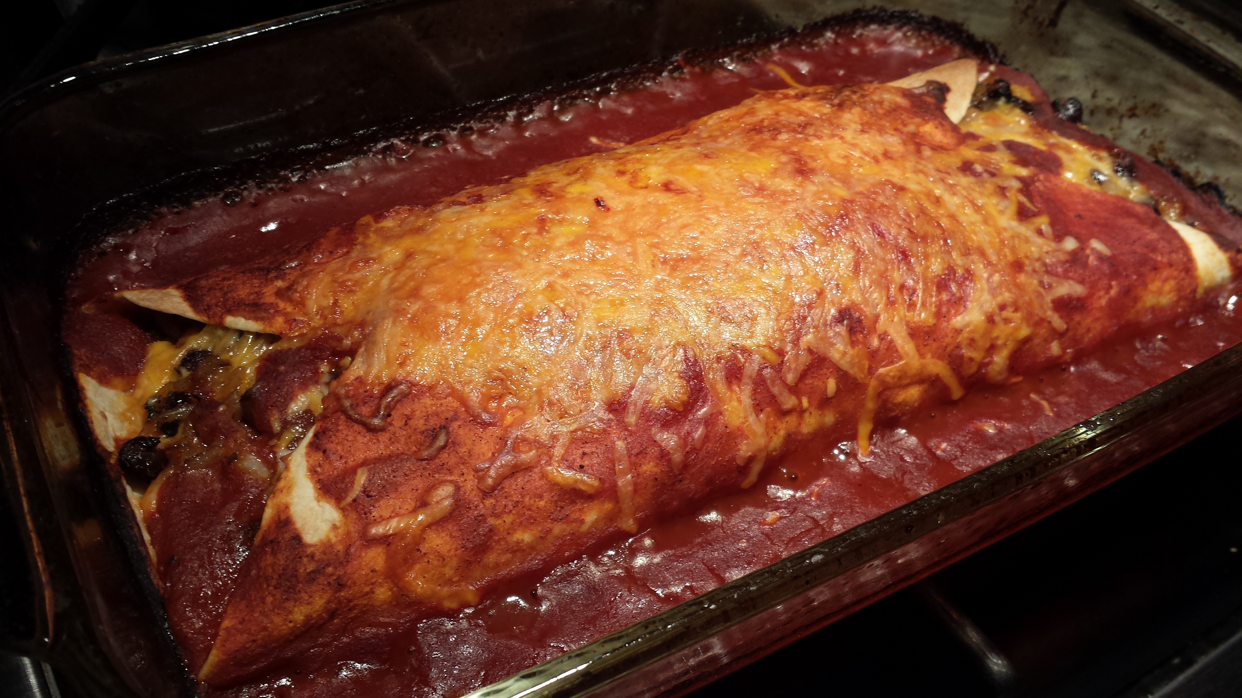 GiantEnchiladaAI Super Vegetarian Enchilada: Black Beans, Brown Rice, Sauteed Onions, Mexican Four-Cheese Mix, Cilantro, and smothered by my Homemade Red Enchilada Sauce (Photo Credit: Adroit Ideals)