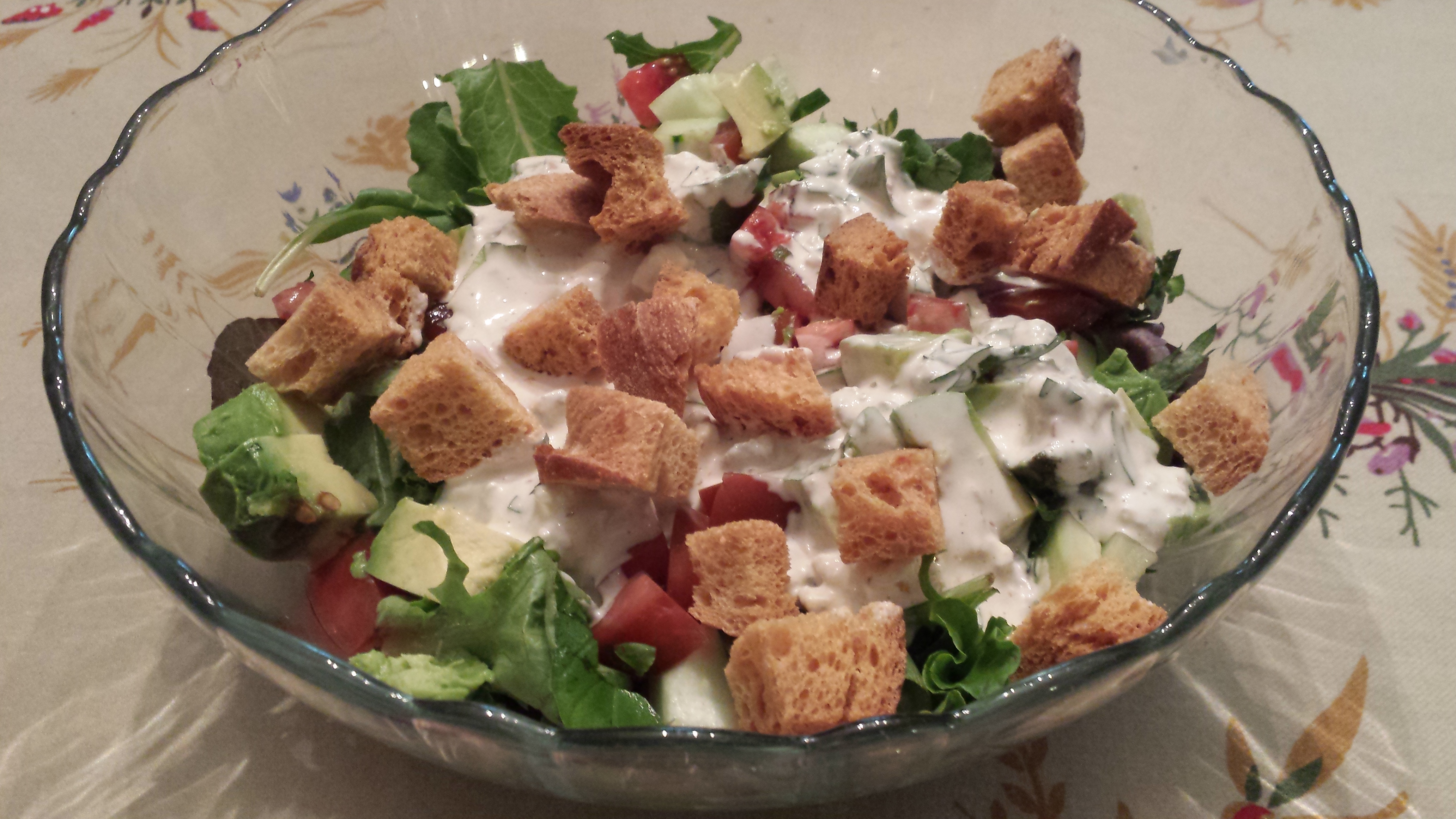 TheBigSaladWithCroutonsBleuCheeseAI Colorful Garden Salad of Spring Mix, Cucumbers, Tomatoes, Avocado, Garlic Chives, Basil, and Parsley topped with Low Fat Bleu Cheese Dressing and Homemade Croutons (Photo Credit: Adroit Ideals)