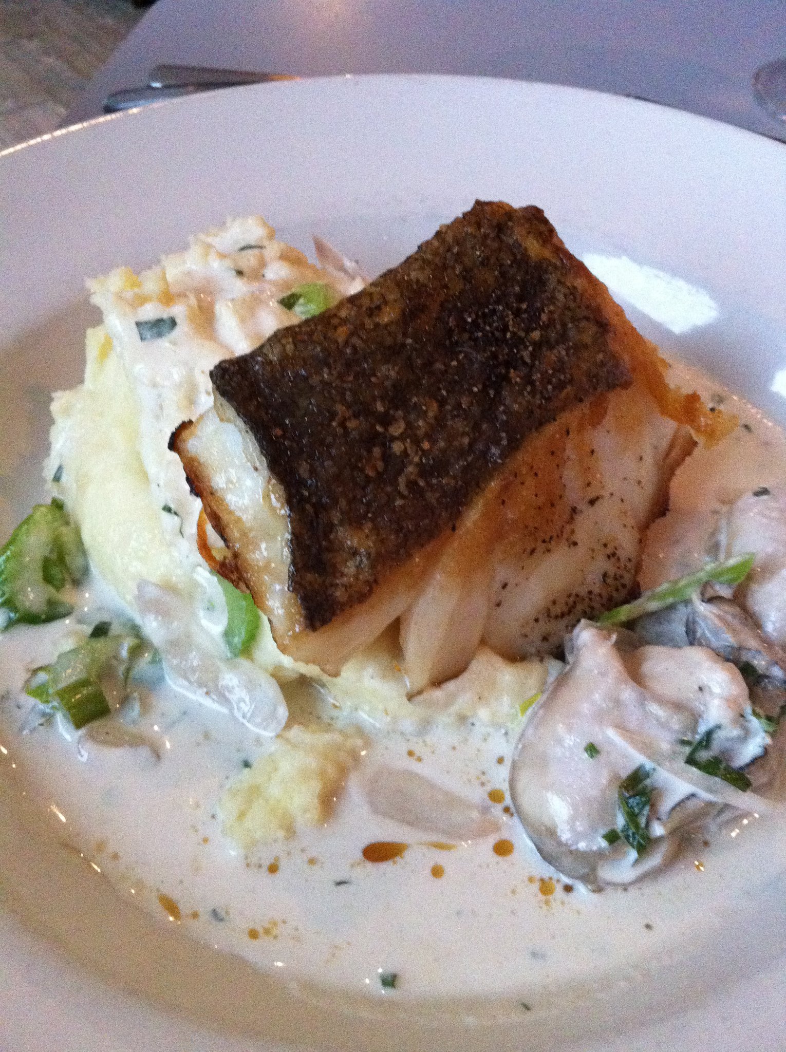 NESKCodOysterStewMashedTatersAI NorthEast Seafood Kitchen’s Seared Cod over Creamy Mashed Potatoes draped with Oyster Stew (Photo Credit: Adroit Ideals)