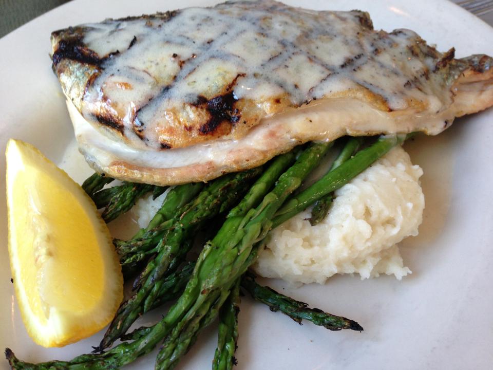 NESKRainbowTroutAI Rainbow Trout over Asparagus and Mashed Potatoes at NorthEast Seafood Kitchen (Photo Credit: Adroit Ideals)