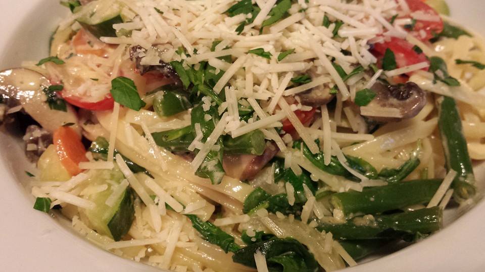 PastaPrimavera15AI Pasta Primavera: Spinach, zucchini, carrots, mushrooms, green beans, pear tomatoes, and shallots tossed with a creamy linguine and topped with basil. (Photo Credit: Adroit Ideals)