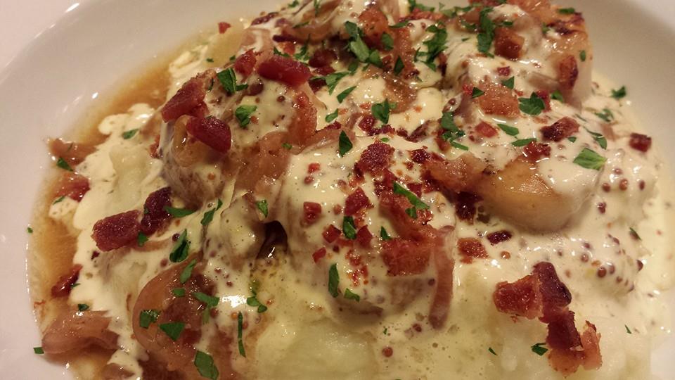SearedScallops8AI Seared Scallops and Shallots over Mashed Potatoes with Dijon Cream Sauce and real Bacon Bits! (Photo Credit: Adroit Ideals)
