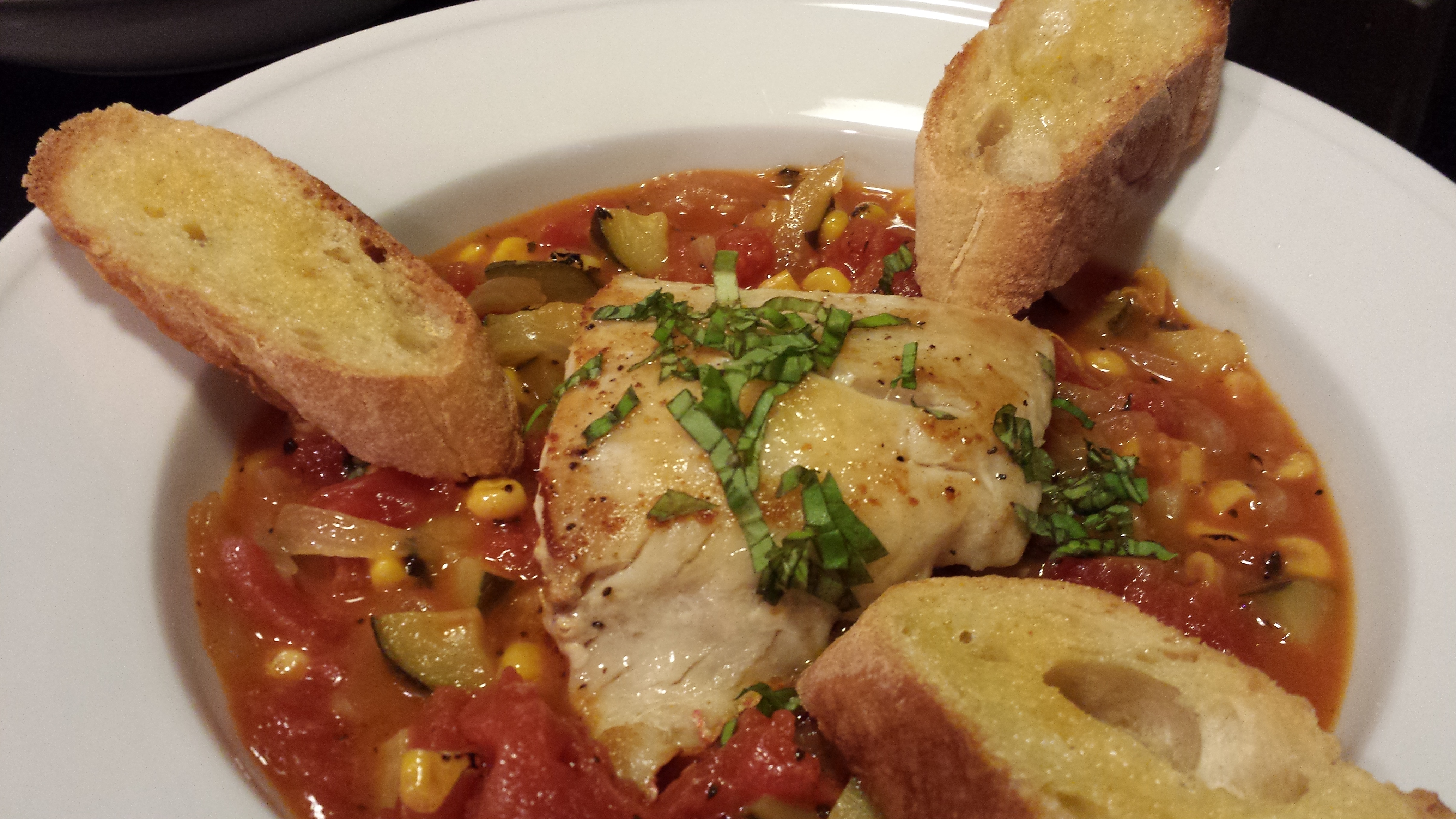 SearedSnapperSummerVegStew44AI Use that Garlic Toast to sop up that Seared Red Snapper over Summer Vegetable Stew (Photo Credit: Adroit Ideals)