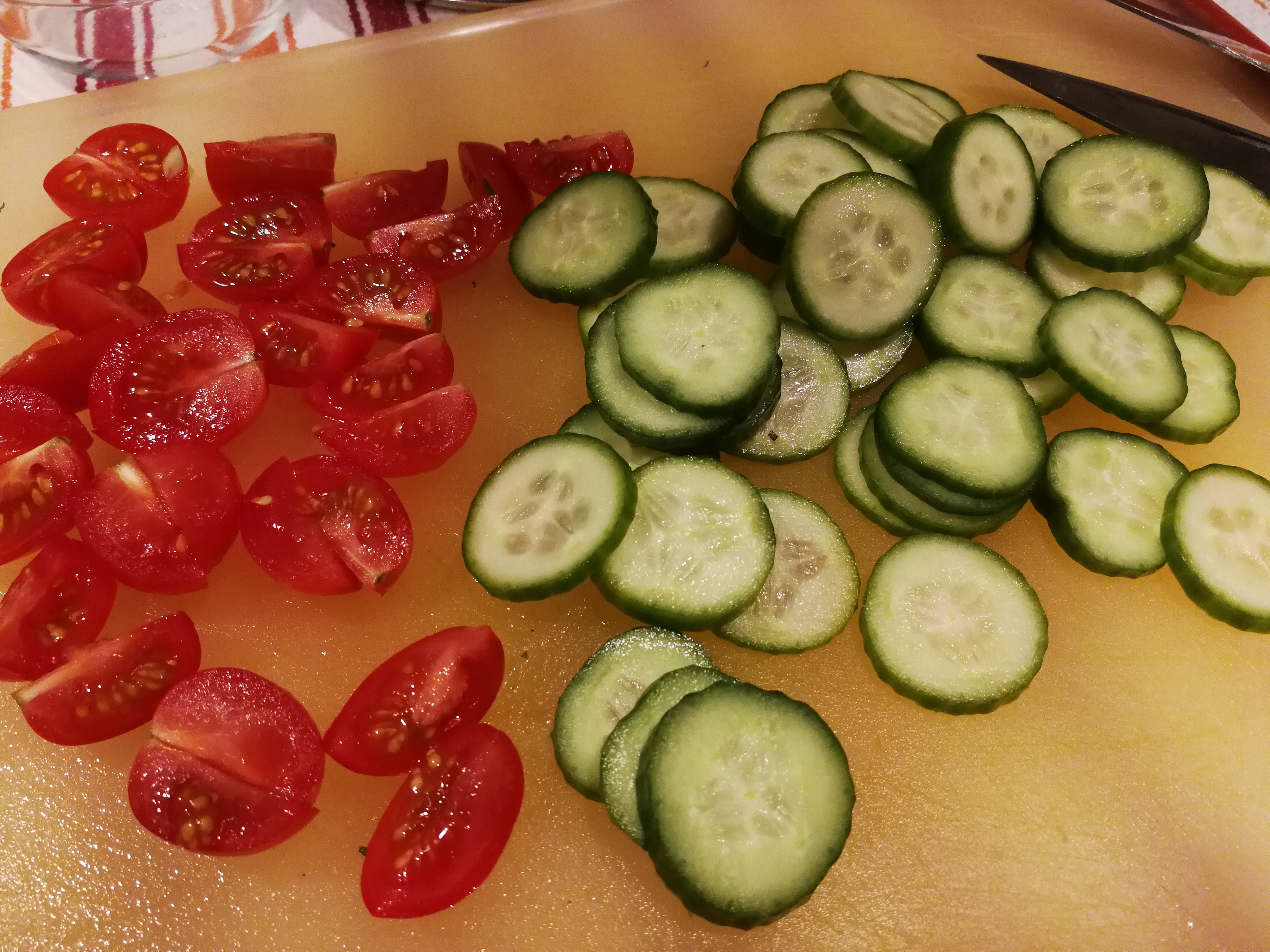 PrepareCukeTomatoAI Slice some mini cucumbers into coins and quarter some cherry tomatoes (Photo Credit: Adroit Ideals)