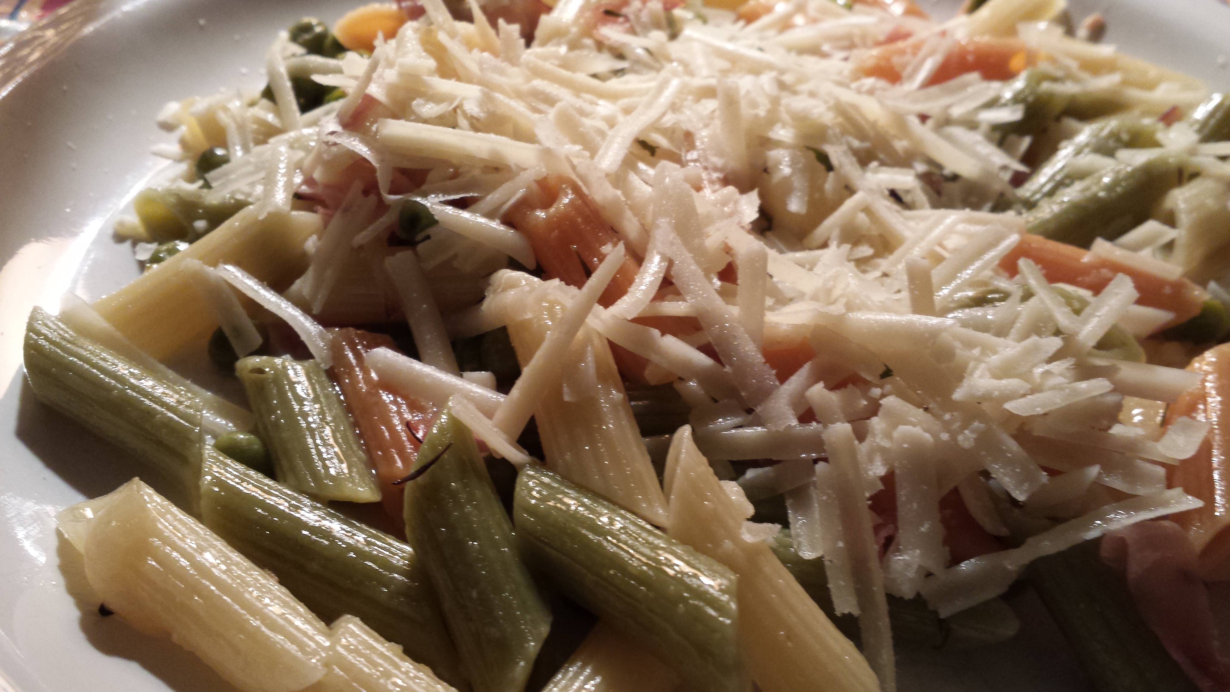 Tri-color Penne with Maple Ham, Peas, and Parmesan (Photo Credit: Adroit Ideals)