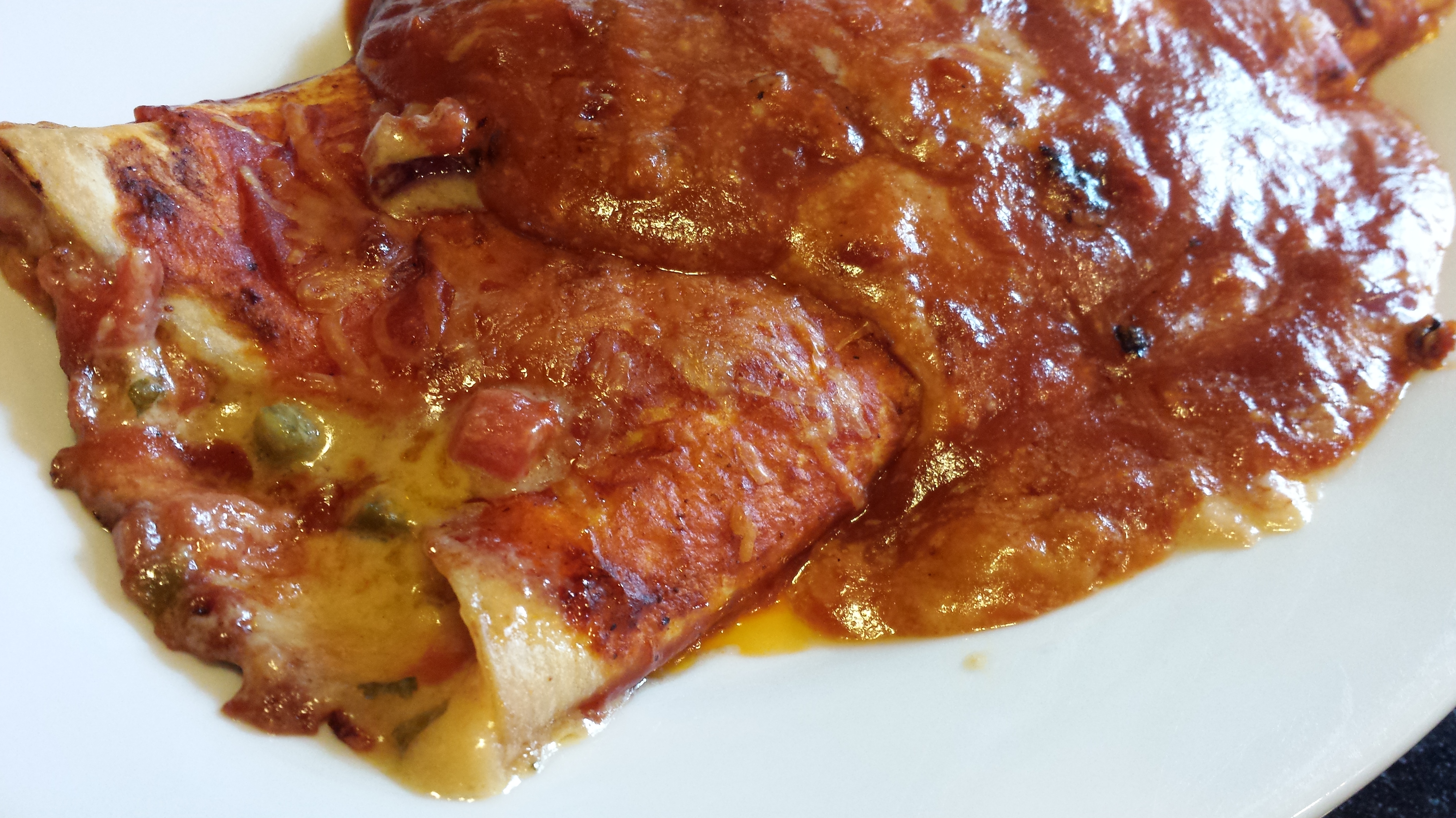 ZestyEnchiladaAI Zesty enchilada stuffed with four cheeses, diced tomatoes and green chiles and smothered with homemade enchilada sauce (Photo Credit: Adroit Ideals)